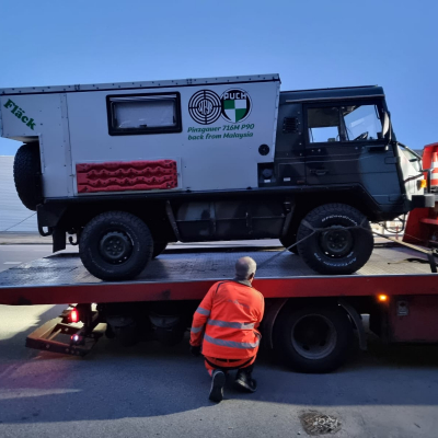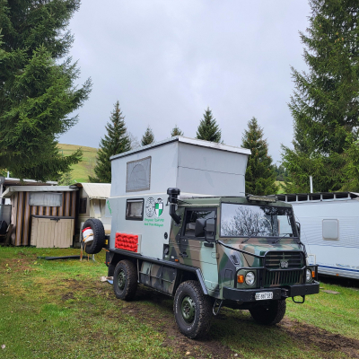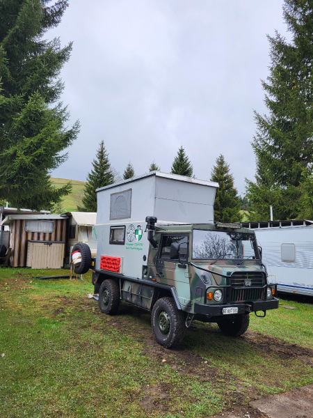 Pinzgauer ehemals der Armee Malaysia umgebaut auf Wohnmobil, Autark gebaut kann Wasser Pumpen für das Fahrzeug. Abmessungen 4.9x1.8x2.2Meter. Besonderheit Luftfederung an der Hinterachse deswegen immer Kompressor im Fahrzeug zum Pneu füllen. Wattiefe nach Hersteller 700mm Achsfreiheit 335mm. Geländedaten 45° Steigfähigkeit, 26° Schräglage im jetzigen Ausbau, Böschungswinkel V/H 45°/37°