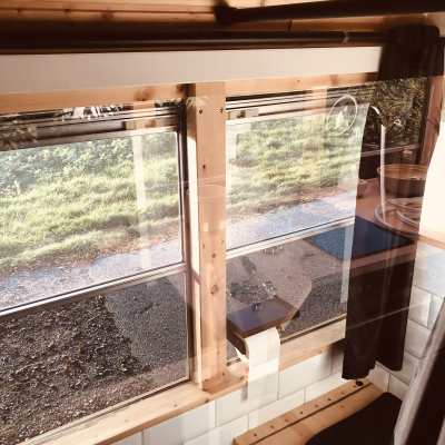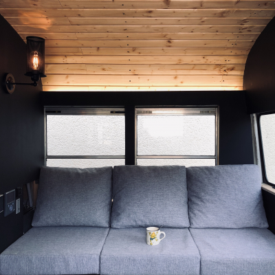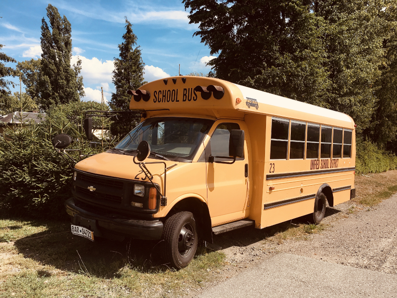 Full-Living-Konzept und -Ausbau eines US-Schulbusses. Komplettes Badezimmer mit Toilette und Dusche, vollausgestattete Küche mit Induktionsplatten, Heißluft-Backofen, großer Spüle, große Sitzecke, umbaubar zum 1,50m x 2,30 großen Bett, Fußbodenheizung, komplettes 230V-System mit 2000 W Solarleistung auf dem Dach und etwa 11 kWh Batteriekapazität über Tesla-Module.