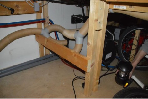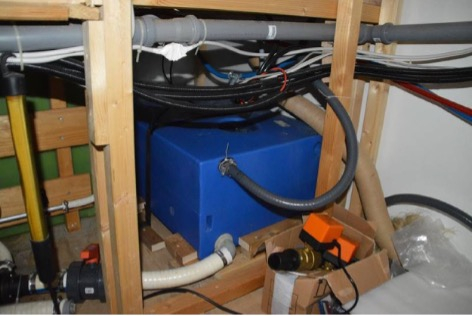 | Der Frischwassertank, sowie der Grau- und Schwarzwasser-Tank befinden sich im 70 cm hohem "Keller" (Stauraum) im hinteren Teil des Fahrzeugs. Dort sind auch die 3 Wasserpumpen. | |