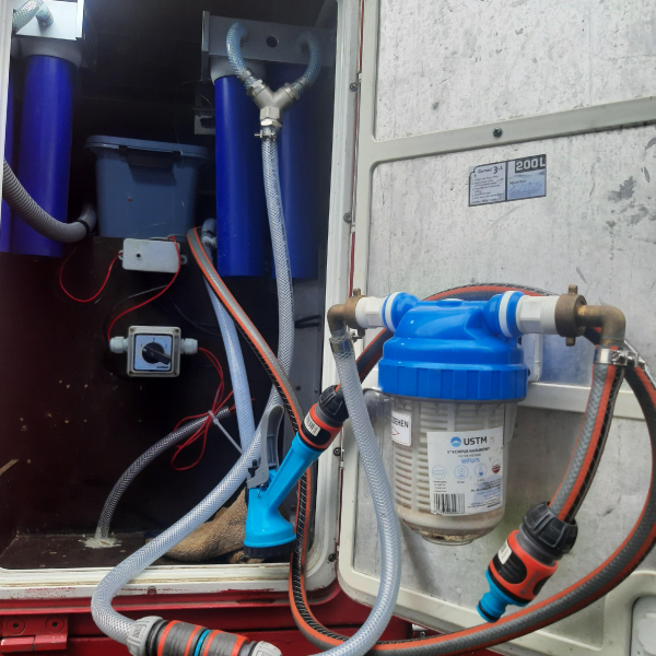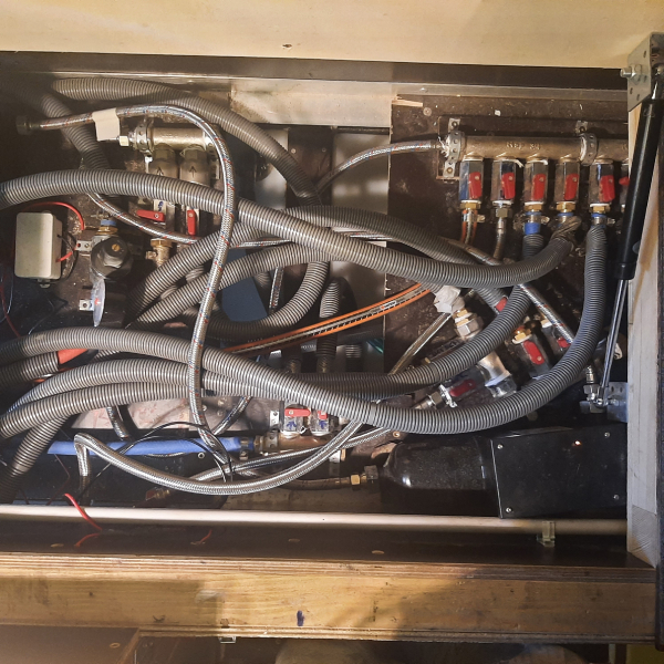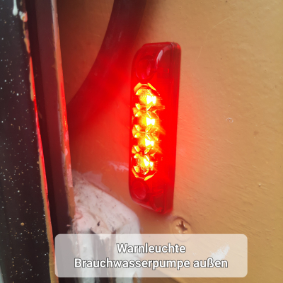 Bei eingeschalteter Brauchwasser-Druckpumpe leuchtet innen und Außen eine Warnleuchte. Dadurch wird verhindert, dass man die Pumpe angeschaltet lässt und weggeht. So wird verhindert, dass bei einem Leck der Druck absinkt und das ganze Wasser aus einem Tank in den Aufbau gepumpt wird |