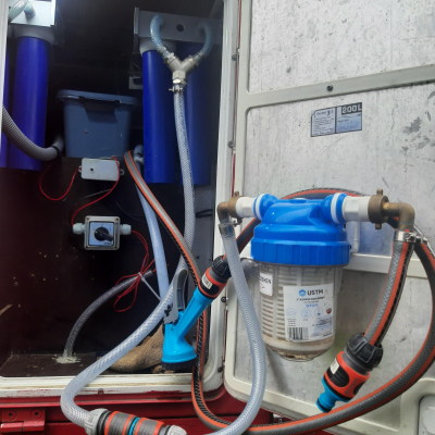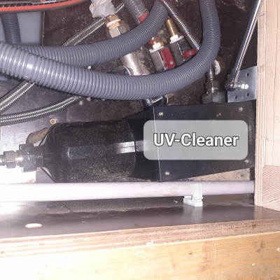 water flow | Oberflächenwasser mit Kärcherpumpe durch Keramikfilter in die Tanks. Brauchwasser mit Druckpumpe durch UV-Cleaner und Kohlefilter zu den Verbauchern. |