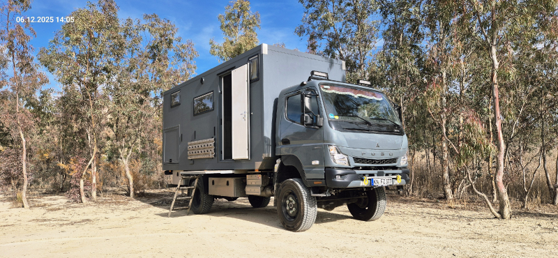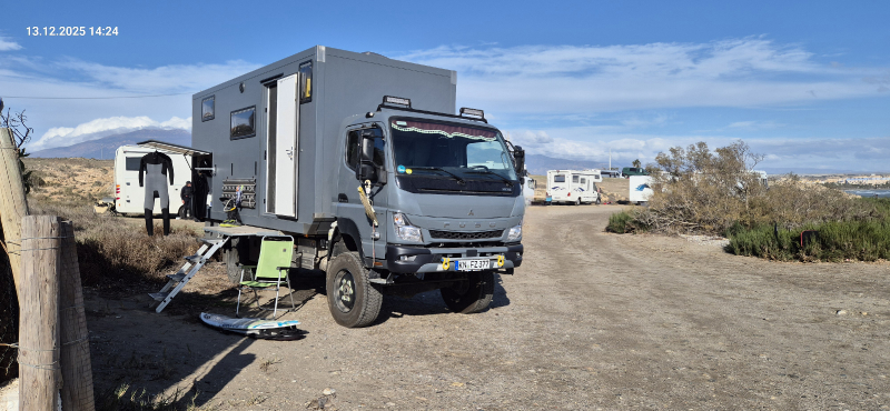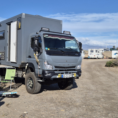 Tank ausgetauscht gegen einen 250 Liter Tank. AdBlue Tank wurde weiter nach hinten versetzt. Gewicht kpl. reisefertig, d.h. incl. Fahrer, 250 l Diesel, 480 l FW, Kite-Equipment, MTB, Werkzeug, Ersatzteile, Diesel Reservekanister, AdBlue Reservekanister, Lebensmittel, Klamotten, usw., ca. 6100 kg. | |