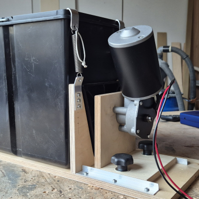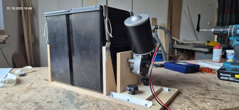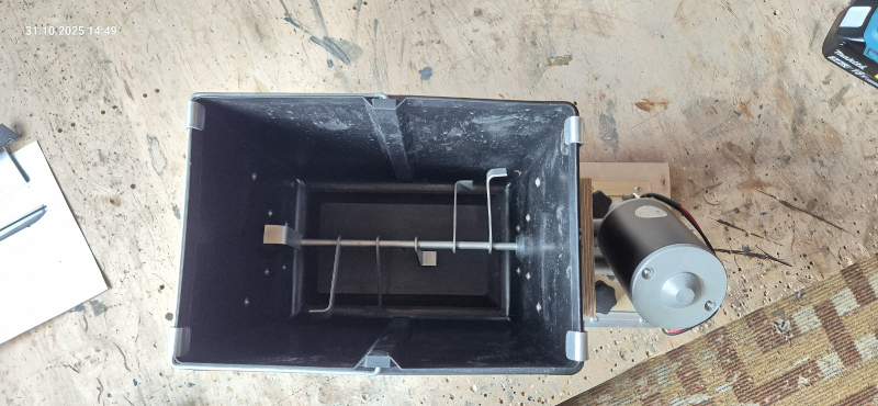 Der Feststoffbehälter ist nun mit Rührwerk, gekauft als Ersatzteil einer anderen Komposttoilette. Antrieb durch einen 12V Getriebemotor (60 rpm) der mittels Wippschalter mit 2 Stellungen in beide Drehrichtungen laufen kann. PC-Lüfter sorgt für Abluft. Hi-Tech im Klo: 2 Sensoren (berührungslos) erkennen den Pipi-Füllstand. Signalisation mittels 2 LEDs Grün: Halbvoll Rot: Sofort leeren, reinpinkeln verboten! | |