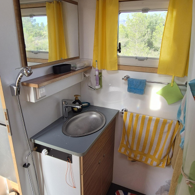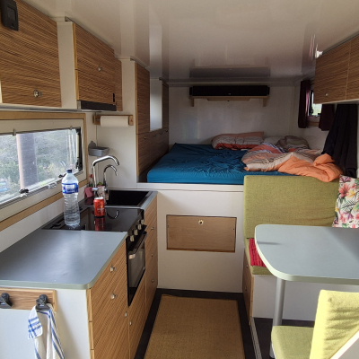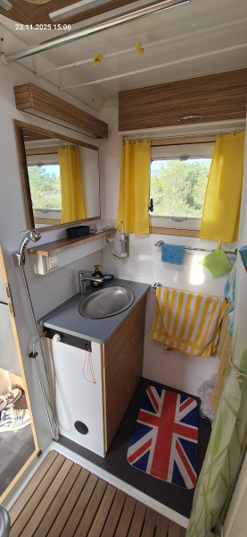 Die Hängeschränke wurden mit einem Zwischenrahmen aus Tischlerplatten mit Sikaflex 292i an die Decke geklebt. In den Zw.rahmen befinden sich mehrere M8 Gewindeinsätze, die Schränke können somit jederzeit abgeschraubt werden. Die Platten für das Bett sind 30 mm dick, wiegen jedoch nur 4 kg/qm. Garnica Ultralight Pappel Sandwich. Die Matratze ist 160 x 200 cm. Links und rechts davon sind dann noch je 8 cm Platz für Ablage und Lichtschalter. Die Soundbar hängt an die Rückwand unter die Decke. Hierfür wurde eine Konsole mit integrierter Beleuchtung gebaut. Die Duschwanne ist Eigenbau. Hierfür wurde eine Positivform aus MDF-Platten gebaut, gespachtelt, geschliffen, gefüllert und lackiert. Danach überlaminiert, geschliffen und lackiert. Der Doppelboden (18 cm lichte Höhe) besteht komplett aus Klappen und lässt sich vom Bett bis zur Eingangstür vollständig öffnen. In einem Abteil sind Wasserpumpe, Druckbehälter, Druckminderer, etc.. In einem anderen wird, gut zugänglich, die Elektrik installiert (außer Akkus und Multiplus, die sind unter der Sitzbank). Die restlichen sind Stauraum. AEG Abzug in der Küche, Abluft nach draußen. | |