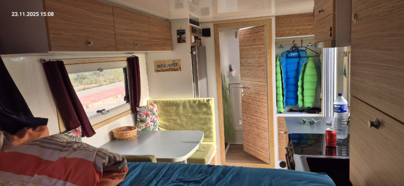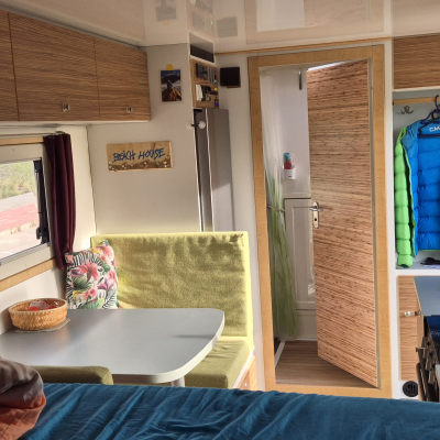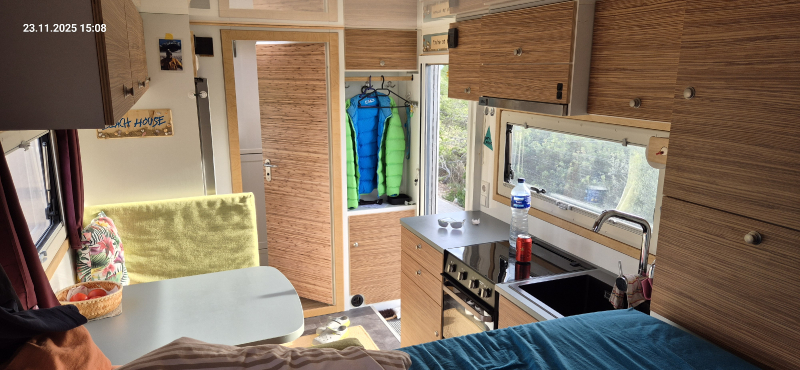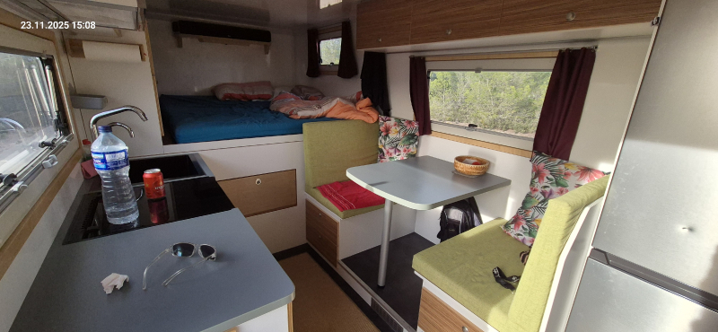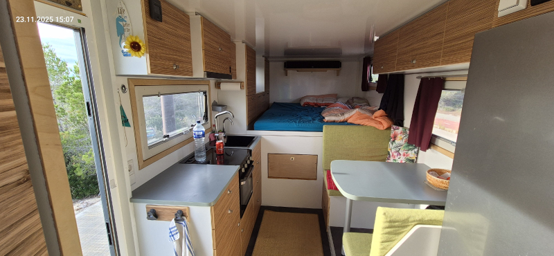 Eingangstüre, Durchgangstüre zum Fahrerhaus sowie Stauraumklappen sind von Outbound. Doppelboden ca. 200 mm, hauptsächlich für Technik. Teilweise auch noch als Stauraum nutzbar. Die Seitz-Fenster wurden als erstes umgerüstet da sie nicht moskitodicht sind. Moskitonetze wurden gegen schwarze Neher-Netze getauscht. Diese sind nun breiter und reichen seitlich ganz bis an den Rand, so das hier keine Moskitos mehr durchkommen. Das Material ist stabil und schrumpft nicht mit der Zeit. Außerdem sind sie schwarz un bieten einen super Durchblick. Über den Rollen wurden außerdem Bürstendichtungen angebracht, so das auch hier dicht ist. Die Verdunklungen wurden ebenfalls neu gemacht, mit dem gleichen Material, jedoch ebenfalls breiter bis an den Rand. Für den Durchgang zum Fahrerhaus wurde ein Stück der Kabinenwand verwendet (Reststück Fensterausschnitt) und mit Schloss und Griffen versehen. 2 Gasdruckdämpfer halten die Klappe offen. | |