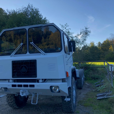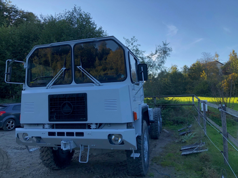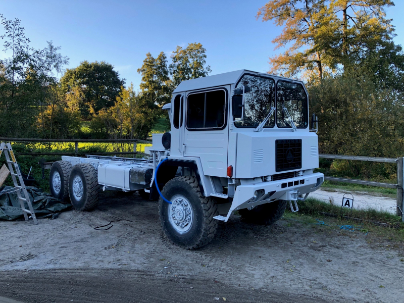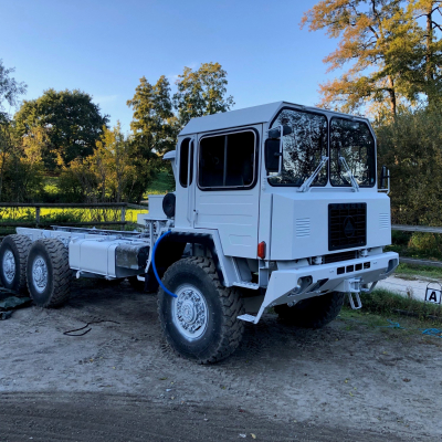 Saurer 10DM, Jg 1985, ursprünglicher Aufbau aus Stahlrahmenkonstruktion, alubeplankt, ist verkauft. Er wird durch einen 21Fuss-Bürocontainer in Sondermass 640x243x230cm ersetzt. Dieser wird fensterlos hergestellt, einzige Öffnung ab Werk ist die Outbound-Türöffnung. Im Anschluss erfolgt der Fenstereinbau. Zwischenrahmen Federgelagert von Exped Konzept, komplett vor Ort vermessen und montiert.