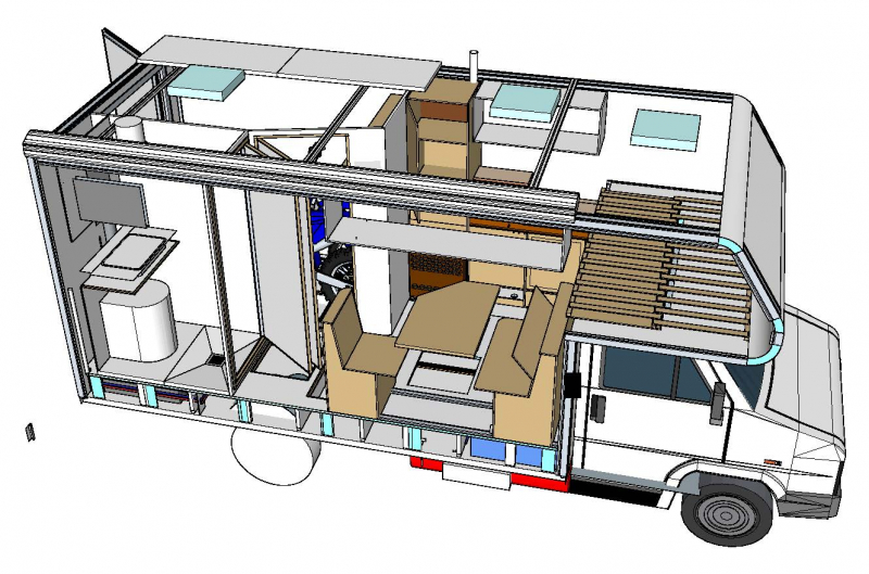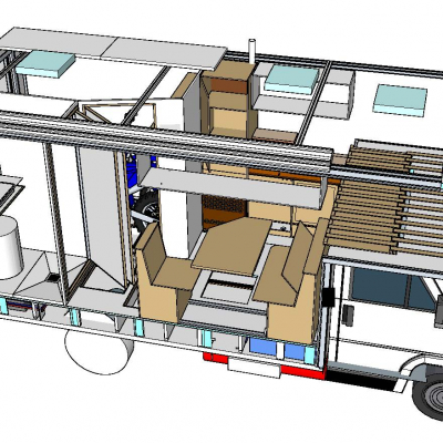 Sandwich panels manufactured, cut to shape and delivered to door by company www.dalalaminat.se Double floor: Inner floor 25 mm thick (2x 1,8 mm GRP skin, distance material: 21,4 mm XPS). Garage for two dirt bikes. | |