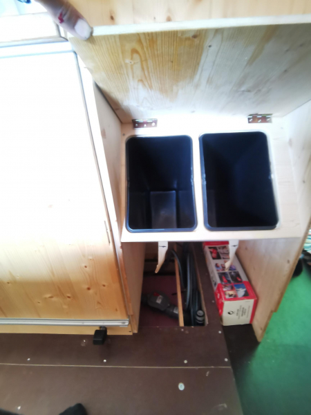 Es gibt 3 Wassertanks: 64 Liter + 2x 150 Liter (im doppelten Boden) Der Abwassertank ist außen mit ca. 500 Liter | |