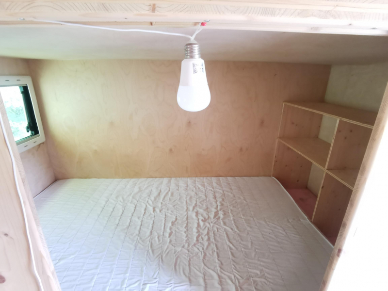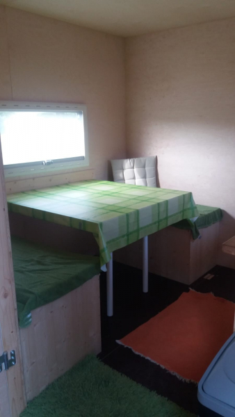 hinten: befindet sich unten Stauraum, hat ca. 110 cm Höhe, 115 cm Tiefe und ca.240 cm Breite, Zugang durch Hecktüren darüber befindet sich ein Doppelbett/ 2 Schlafplätze mit Fenster - Zugang durch Eingangstür seitlich in der Mitte: sind rechts und links Etagenbetten/4 Schlafplätze mit je 1 Fenster seperates Bad mit Dusche, Wc und Waschbecken und 1 Fenster Vorraum + Garderobe Vorne: ist der Esstisch mit Stauraum in den Bänken gegenüber die Küche mit Dieselkocher, Abwasch, Kühl-und Gefrierbox, Stauraum, Müll, ... |