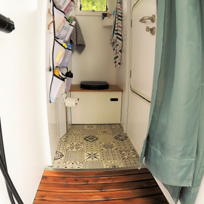 Fahrerseite von vorne nach hinten: Toilette, Küche, Bett Beifahrerseite von vorne nach hinten: Dusche, Sitzgruppe, Bett Fahrradgarage unter dem Bett |