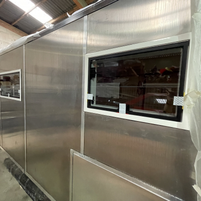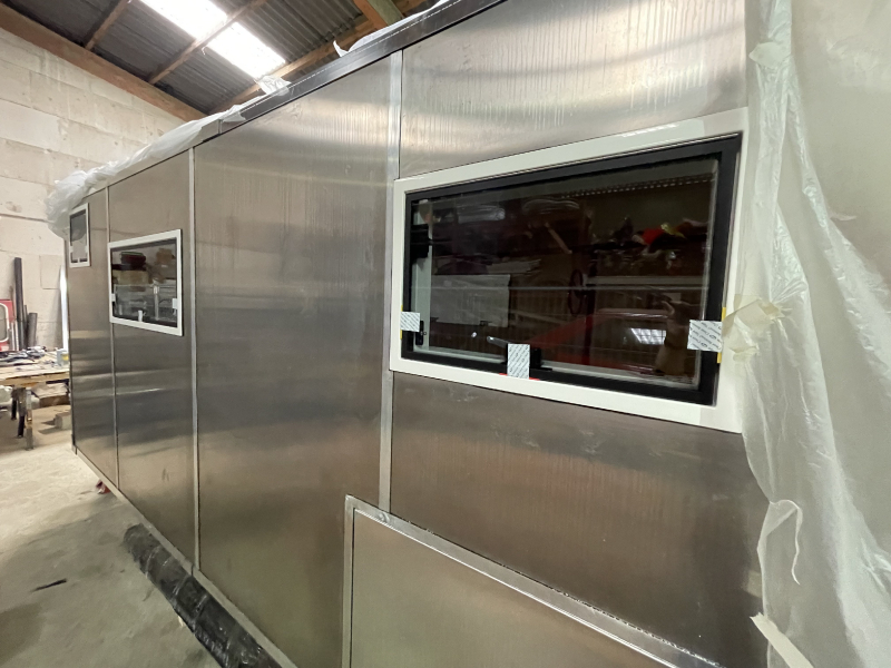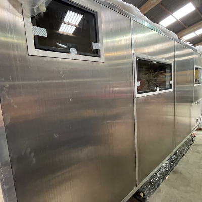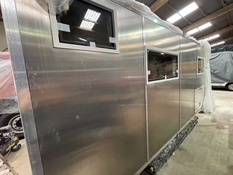 | Zwischenrahmen ist gefertigt aus 2 Längslieger 160x80x4mm und quer verbunden mit Röhre 108x5. Die Box ist aufgebaut aus Stahl-Profile 80x40x3 und 60x40x2 Im Boden sind Hut-Profile eingeschweißt welche Nachherr mit Schrauben M12 am Zwischenrahmen befestigt werden. Auch seitlich wird der Boden an den Seitenarmen befestigt mit M12 Bolzen. Aussen wird die Wand geklebt mit Alu platten 2,5mm und im Boden (zwischen die Hut-Profile) 2,5mm. Isolierung mit Pur 60mm und XPS 8mm (Boden) | |