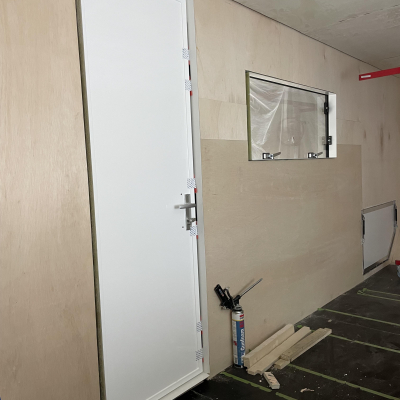 Durchgang aus Alu. Aussen und Innen-Teil thermisch isoliert. Die beide Luken (Stauraum) sind wie der Durchgang im gleichen Prinzip gebaut. |
