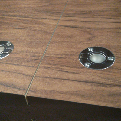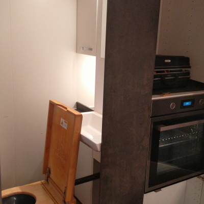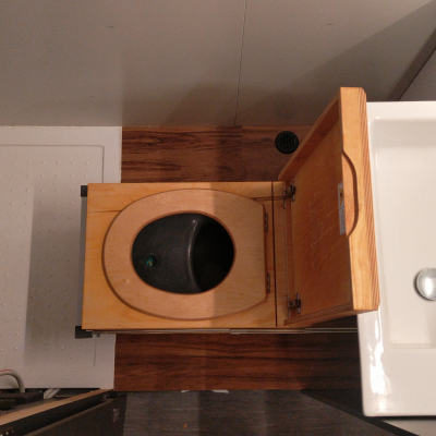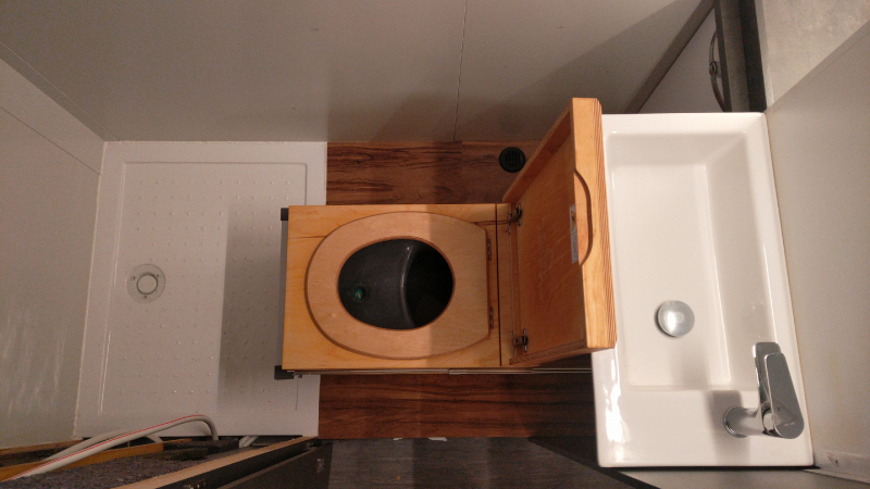 Toilette wird über zwei rastbare Schwerlastauszüge in den Raum gezogen, und zwar mit einem leichten Gefälle in den Schienen, damit das Gehäuse ganz ausgefahren auf dem Boden steht und eingefahren ca. 1cm über dem Boden "schwebt". Vermeidet Schleifspuren auf dem Boden. 2 Zusatz-Urinkanister für längere Standzeiten ohne Entleerungsmöglichkeiten | |