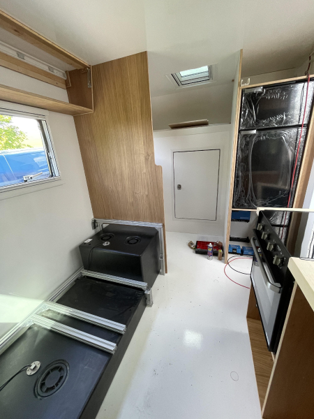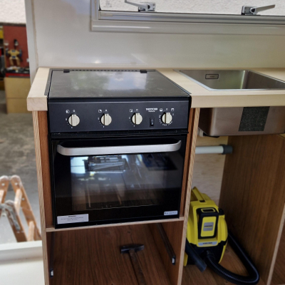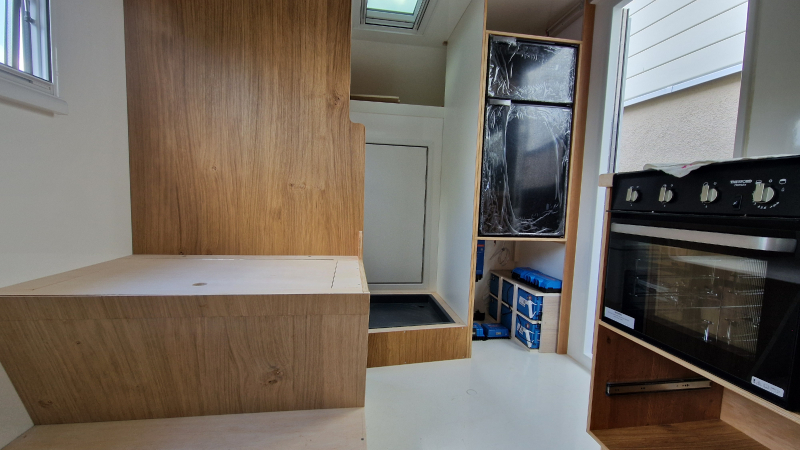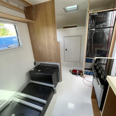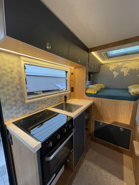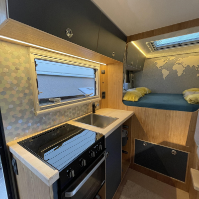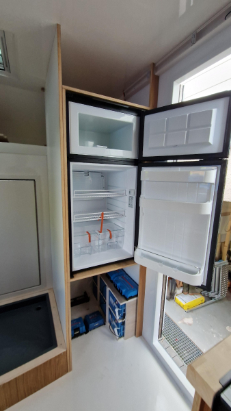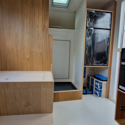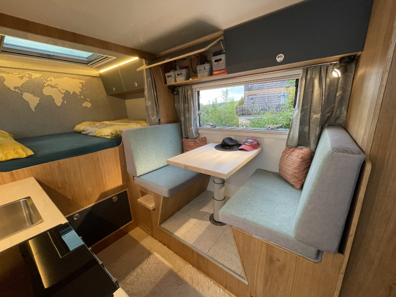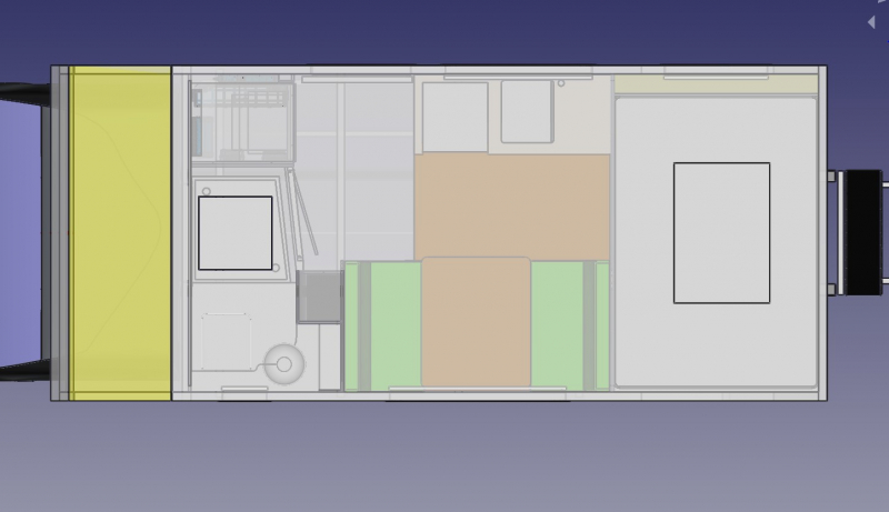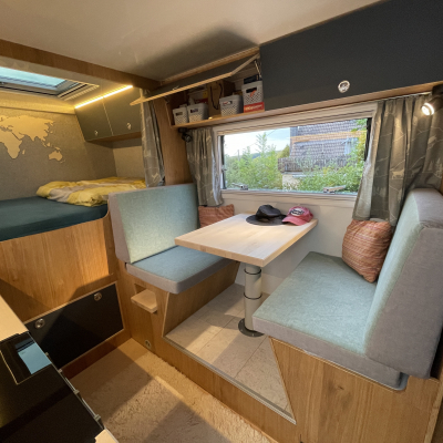 Wir haben einen kleinen Stauraumalkoven über dem Fahrerhaus. Anschließend gibt es eine Nasszelle mit Dusche und Trockentrenntoilette. Daneben ist der Kühlschrank/ Eisschrank untergebracht. Im Mittelteil ist die Küchenzeile und die Dinette. Unter der Dinette sind die Frisch- und Grau- Wassertanks platziert. Hinten ist der Schlafraum mit einer 2,0m x 1,4m Matratze. Darunter befindet sich der "Keller".