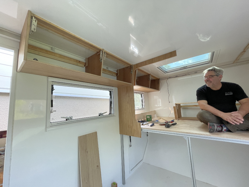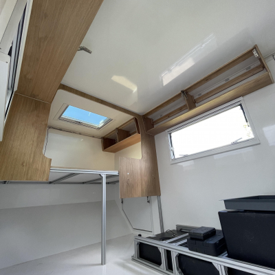 Für die Oberflächen Wände/Schränke haben wir Queenply Multiplex Asteiche eingesetzt und für die Klappen/ Türen Queenply Multiplex grau extrem matt. Unterkonstruktionen sind mit Aluprofilen oder auch mit Birke Multiplex ausgeführt.