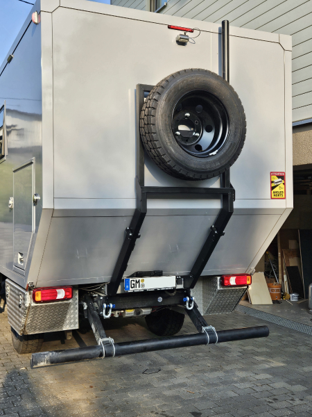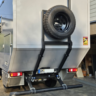 Rear carrier Eigenbau für Reserverad und Sandbleche mit Erweiterung als Fahradträger