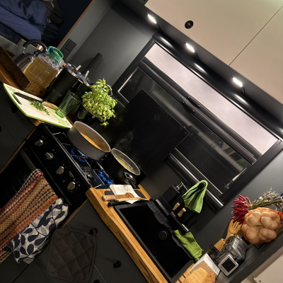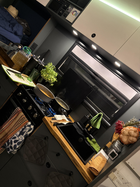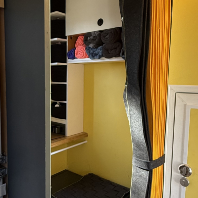 | Kabelkanäle in den Hochschränken. Deckel können in jedem Hochschrank von den Kabelkanälen abgenommen werden, so daß wir jederzeit an die Kabel kommen können. Außensteckdose gelegt und den FI Schalter gesetzt. Erste Lampen am Bett und der Küche installiert. Die ersten Kabel sind verlegt, Steckdosen im Stauraum beidseitig angebracht. Ambientelicht über den Hängeschränken funktioniert. Verkabelung, Mppts, Multiplus etc. kommt unter die Sitzbank vor dem Bett. | |