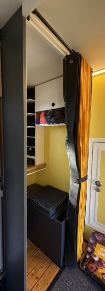Die Box wird in 3 Bereiche aufgeteilt. Eingang = Dusche, Dreckschleuse und gegenüber die Toilette. Küche und Sitzbereich und dann der Schlafbereich. Zum Farbkonzept Schlafbereich - blau, Sitzbereich und Küche - Anthrazit, Eingang, Schleuße und Toilette werden gelb,weiß Von Außen wird er auch noch verschönert, die Box sollen Blätter zieren. So wie oben abgebildet soll er dann mal aussehen. | |