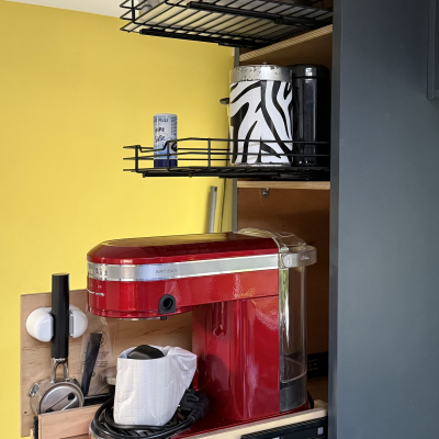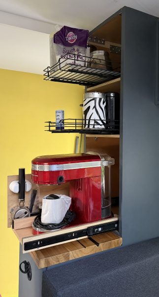 alles in Eigenarbeit. Für die Staukästen im Schlafbereich werden passende Utensilos aus Filz für die Kleidung genäht. Hat sich bislang auch im Wohnwagen bewährt. LED als indirekte Beleuchtung über den Staukästen. Klappen mit Scharnieren von Häfele ( sind super ) befestigt. Zwischenrahmen noch weiß gestrichen. Der erste Schrank entsteht - Apothekerschrank - zugleich Duschwand - Eingang. Jetzt kommt noch das Gegenstück - Schrank für den Kühlschrank und gleichzeitig Wand zur Toilette. Nach Einbau der Frischwassertanks, Bettgestell fertiggestellt und Lattenrost provisorisch draufgelegt. Rückwand für das Bett gebaut. Kalte Rückwände sind einfach zu ungemütlich. Seitliche Bettkästen ebenfalls aus Birke Multiplex mit 2 Klappen jeweils auf beiden Seiten. Oberseite lackiert in der Wandfarbe und versiegelt. Zusätzlicher Stauraum unter dem Bett über den Wassertanks - Platz für 5 40x60x12cm Euroboxen. Klappe angebracht, Lattenrost montiert und mit Matratzenschoner abgedeckt. Im Eingangsbereich wurden Apothekerauszüge verbaut - Schwerlastauszug. Die kleinere Sitzbank mit Auszug dient als Medienschrank und Ladeschrank für Akkus, Tablets, Mobilgeräte und sonstiges. Die größere Sitzbank ist die Elektrozentrale hier laufen alle Kabel zusammen. Die Sitzgruppe steht auf einem 20 cm hohen Podest mit 2 Staufächern im Boden. Tischgestell ist von Ilse 360° drehbar, sowie nach 2 Seiten verschiebbar und stufenlos verstellbar. Polster bestehen aus Bultex Schaum mit Watte bezogen und mit hochwertigem Polsterstoff bezogen. Höhe der Polster 10cm. Die 2 kleinen zusätzlichen Polster dienen zum Bettumbau und für den Auszug als zusätzliche Sitzfläche. Der obere Schrank am Eingang ist unsere Kaffee und Teebar, mit Auszüge für die Espressomaschine und 2 obere Auszüge für die Espresso und Kaffeetassen sowie die dazugehörigen Utensilien. |