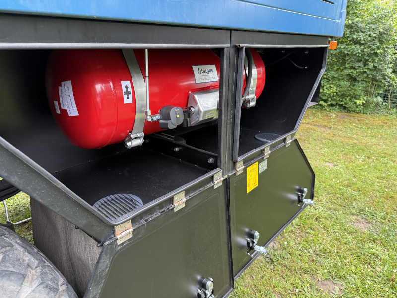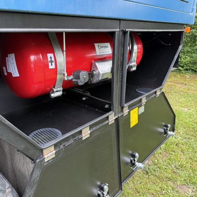 | geplant 100 l Gastank für Boiler und Herd sowie Außenküche. Der Gastank wird in zwei der hinteren Staukästen montiert. |