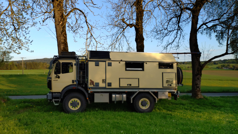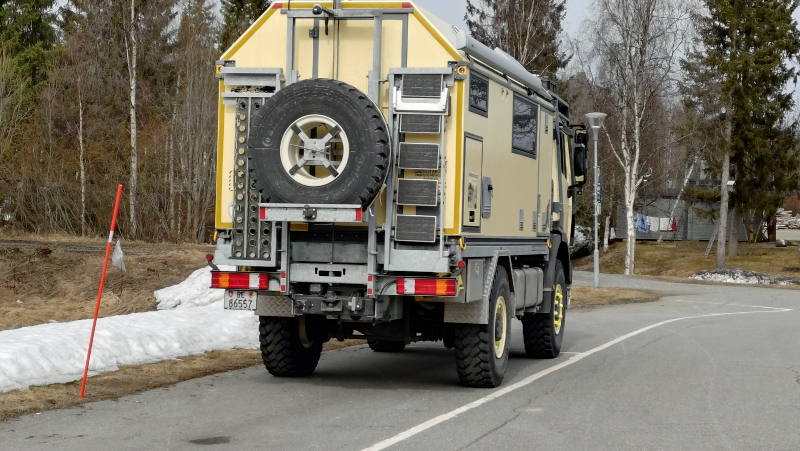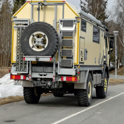 | Lift Heck via Winde 9t absenkbar und in verschiedenen Höhen feststell- und entlastbar. Winde kann durch umhängen und mittels Umlenkrolle auch zur Selbstbergung benutzt werden. Projekt ist bis auf kleinere Weiterentwicklungen im Innern fertig und das Fahrzeug hat im November die Strassenzulassung erhalten. | |