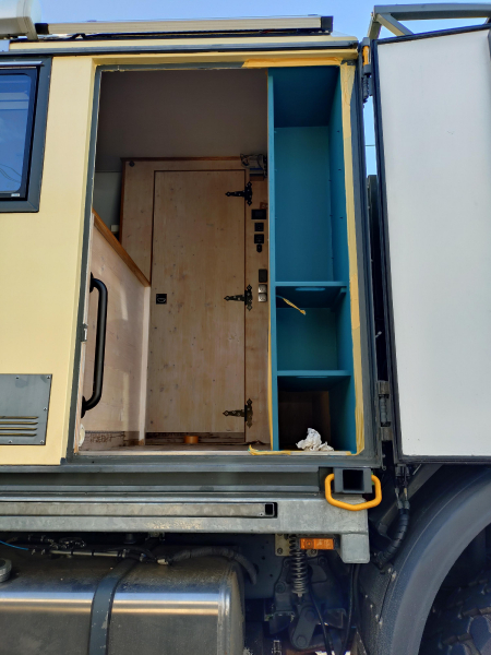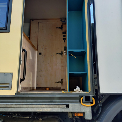 | Ehemaliger Werkstattaufbau aus Schweizer Armeebeständen komplett überholt und dann innen ausgebaut und mit Fenster und Klappen bestückt. Metalleinlagen in Wänden zum Teil wieder benutzt für Befestigungen. Dach komplett vom Gelcoat befreit und neu mit Epoxydlaminaten aufgebaut. Dickschicht Epoxydgrundierung Epifanes rundum und mit Epifanes PU DD Lacken endlackiert. Neuer Boden aus 33mm Okoumé-Sperrholz eingebaut. Zu den Wänden hin sauber abgedichtet und Platten auf Grundrahmen verklebt. Am Schluss kommt PVC Klicklaminat eingebaut. Originaleingangstüre wird am Schluss verschlossen bleiben. Federlagerung ohne Festlager jedoch passgenauen Führungen dito Bild von Vorgängerprojekt. Eingangstüre bleibt die Originaltüre. Ist zwar nicht so hoch, dafür breit um innen von Aussen zugänglichem Stauraum seitlich anzubauen. Im Rahmen wird ein ca.70cm breiter und 1m langer Auszug im Bereich der Türe realisiert. | |