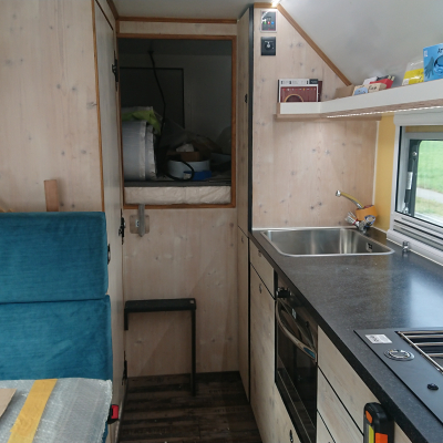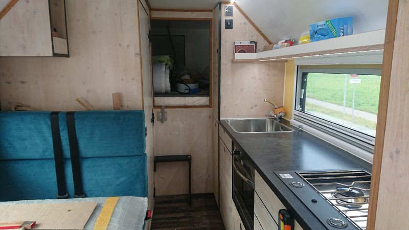 | Grosse Küchenzeile mit viel Platz zum verstauen. Bettabmasse 1250x 2180. also 120x200 mit Staumöglichkeit Fussende und Kopfende. Bettunterbau 30mm 3-Schichtplatte, Froli Scor Mobil Rost und Zugang zu Tankrevisionsöffnungen und Stromverteilung im Heckstauraum. Dusche 80x90cm. Kleines WC Abteil mit Elektrikunterbringung(Wechselrichter, Verteiler usw) Garderobe oberhalb Batterieschacht und Laderegler. Wird mit Wärmeableitung der Elektrikinstallationen leicht beheizt. Heckstauraum beheizbar durch Standheizung. Über dem Bett sowie Küche kommen noch Staumöglichkeiten sowie im Eingangs-Durchgangsbereich zum Führerhaus Staumöglichkeiten. |