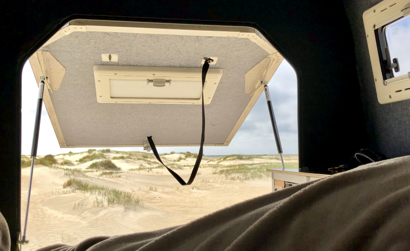 | Beim Grundriss habe ich mich am Landrover orientiert. Links die Küche rechts das Bett. vorne in der Mitte 60L Frischwasser und die Luftheizung. Alle schweren Dinge sind möglichst weit unten und vorne, so dass die Geländegägigkeit nicht eingeschrenkt wird. Die Kabine ist mit ausbau leichter als die Konstruktion Ladefläche + Dachzelt mit Zargesboxen und man kann sich morgens im warmen einen Kaffe kochen :-) |