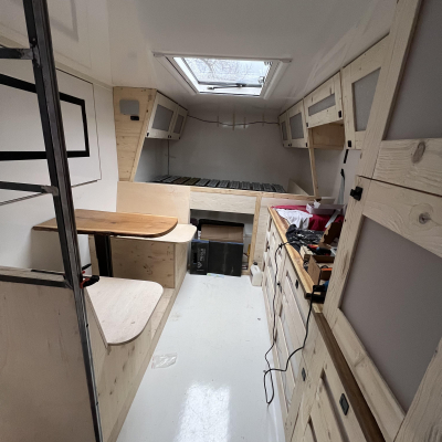 | Schlafen im Heck, 140/200 Bett auf Lattenrost im Anschluss und in Fahrtrichtung links die Küche und im Anschluß die Toilette, in Fahrtrichtung rechts im Anschluß die Sitzgruppe und dann am Eingang die Dusche. |
