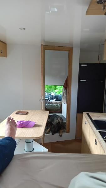 | Klassischer Grundriss mit Nasszelle u. Toilette vorne links, dort auch der Durchstieg, Tür vor der 1,60m langen Küchenzeile, gegenüber eine Sitzecke über 90°, daran anschließend ein 200 x 160 cm Bett in quer. |
