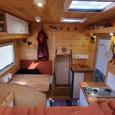 Camping-Truck / Nach 700 Stunden schon fertig....Bisher reisten wir mit einem 29 Jahre alten VW LT1 Karmann, aber es war klar, dass irgendwann ein 7,5to Klein LKW mit möglichst viel Holz innendrin von uns gebaut werden wollte :-) ein Bad brauchen wir nicht, wir sind Camper und duschen draussen mit der Solardusche.....da wir in 2018/2019 10 Monate mit unserem LT auf Tour waren, wissen wir ziemlich genau, was wir für unsere Art zu Reisen benötigen :-) Gutes Internet, robustes Fahrwerk mit Diffsperre, um bis ans Meer zu kommen und auch wieder von dort weg, ordentlich Solarpower und eine Dachluke überm Bett, um in die Sterne schauen zu können !!! Dazu einen große MTB Garage und ein helles Fahrerhaus mit vielen Fenstern und eine Schiebetür am Durchgang, damit die Katze auch mal Ruhe geben kann :-) Ulrichs Buch leistet beim Ausbau sehr gute Hilfestellungen !!! Zudem kochen und backen wir gerne und nun haben wir eine 2,60m breite Küchenzeile, im Ausgangsbereich kann die Arbeitsplatte umgeklappt werden.